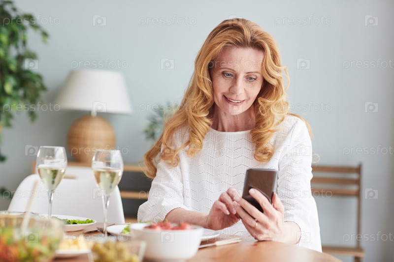 Элегантная зрелая женщина использует смартфон и улыбается