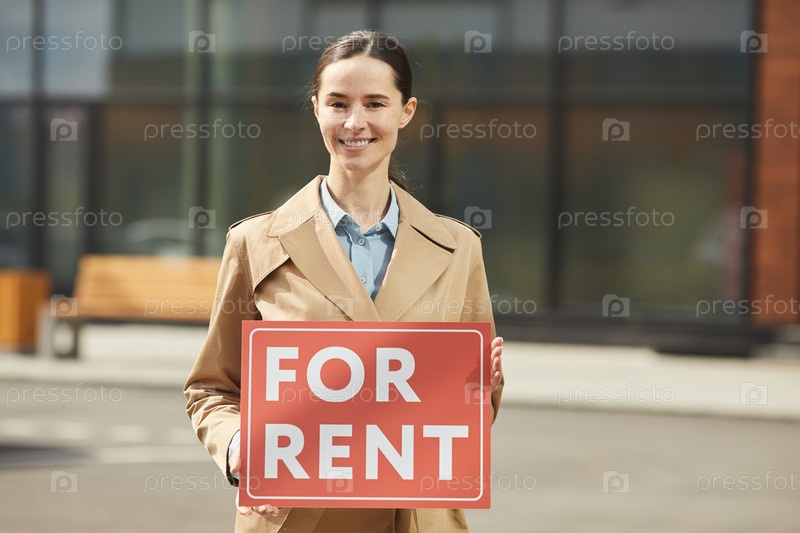 Женщина-агент по недвижимости Holding for Rent Sign