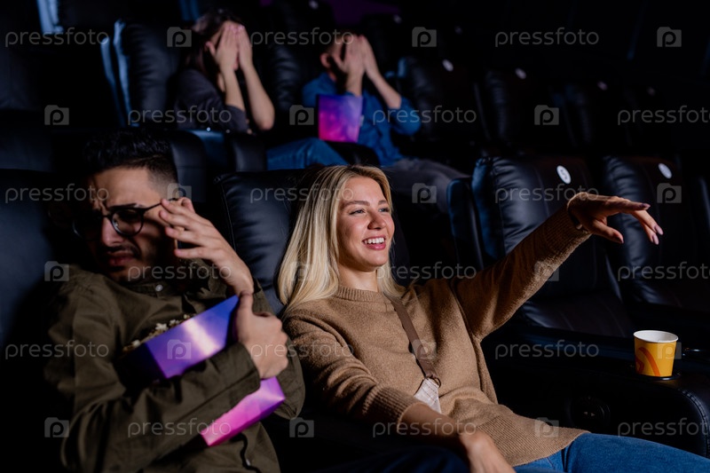 Молодая улыбающаяся женщина, указывающая на большой экран во время просмотра боевого фильма