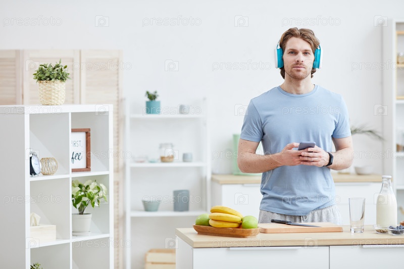 Мужчина, слушающий музыку на кухне