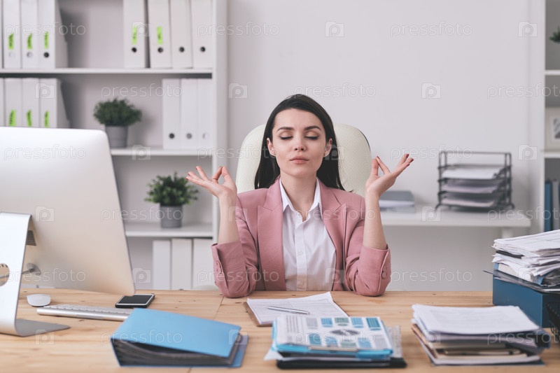 Красивая молодая бизнес-леди в формальной одежде пытается сконцентрироваться у своего стола