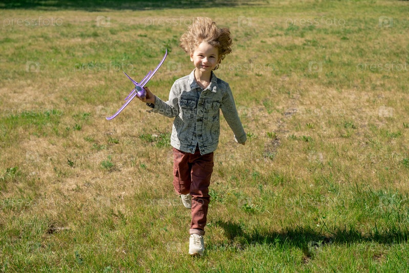 Счастливый милый мальчик с светлыми кудрявыми волосами, держащий игрушечный самолет и бегущий