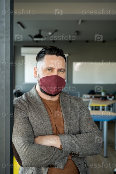 Зрелый бизнесмен в повседневной одежде и защитной маске стоит у двери офиса