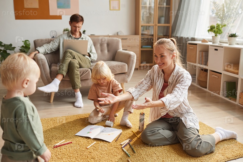 Семья из четырех человек сидит дома