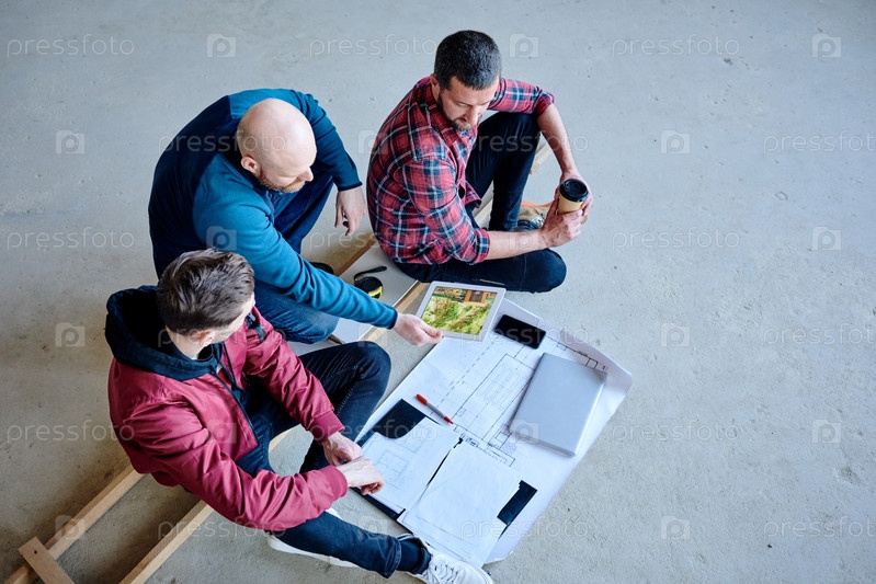 Один из молодых строителей показывает своим коллегам экстерьер готового дома