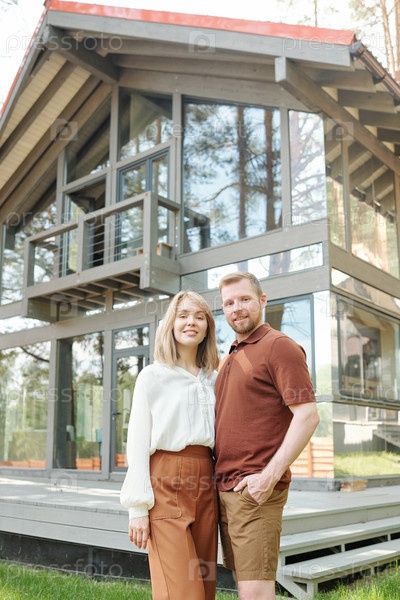 Портрет улыбающейся пары против стеклянного дома