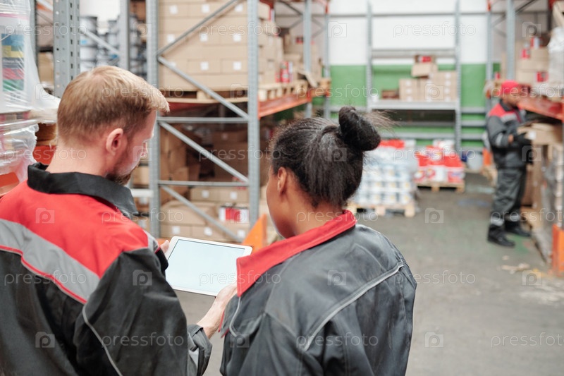 Задний вид молодого мужского главного менеджера в форме и его женской подчиненной