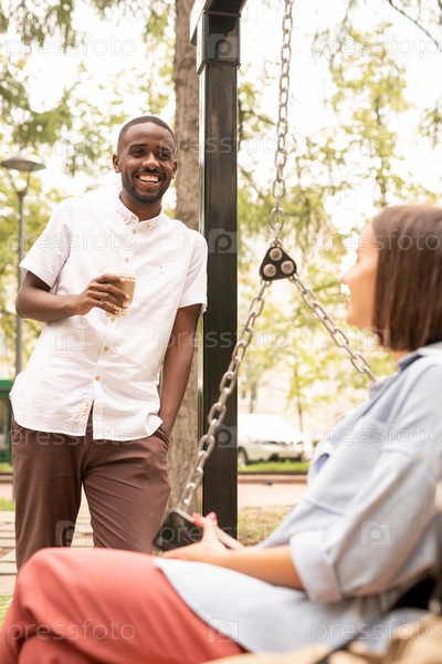 Счастливый африканский парень с напитком стоит перед молодой женщиной, расслабляющейся на качелях