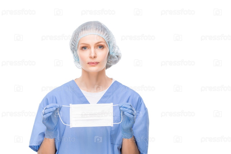 Красивая молодая медсестра или хирург в синей форме и перчатках, держащие защитную маску