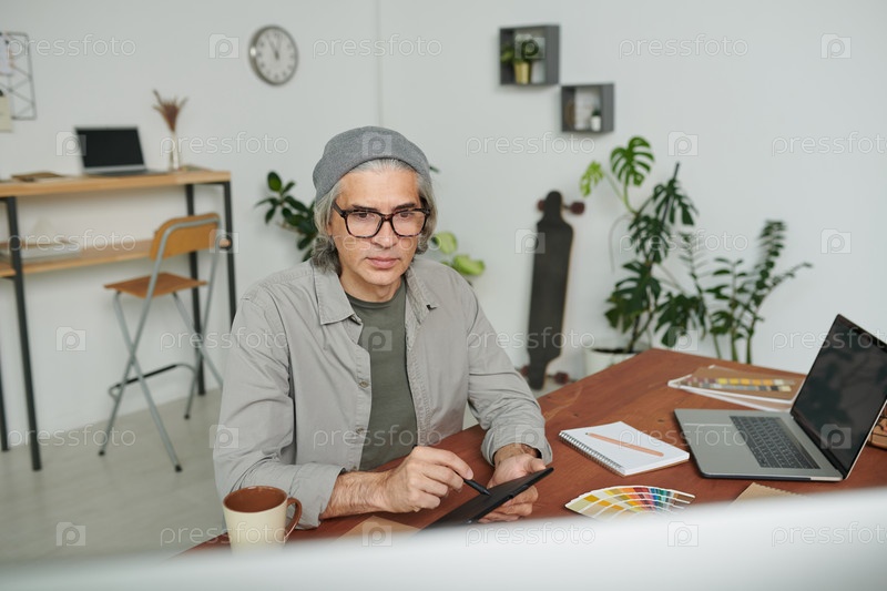 Серьезный зрелый графический дизайнер в шляпе и очках работает в домашнем офисе и изучает макет дизайна