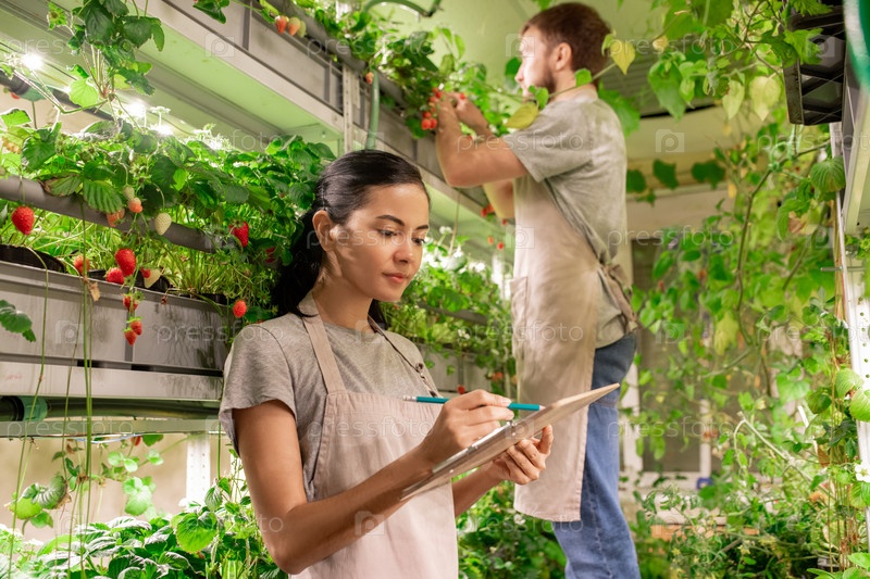 Молодая серьезная селекционистка или садовница, указывающая на документ с записками