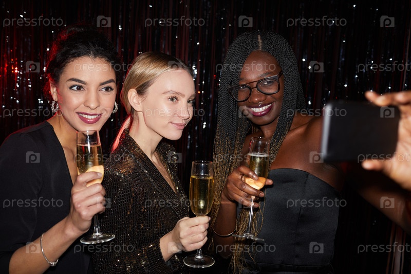 Элегантные молодые женщины делают селфи на вечеринке в ночном клубе