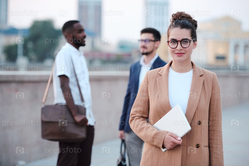 Молодая брюнетка-менеджер с цифровым планшетом стоит перед камерой