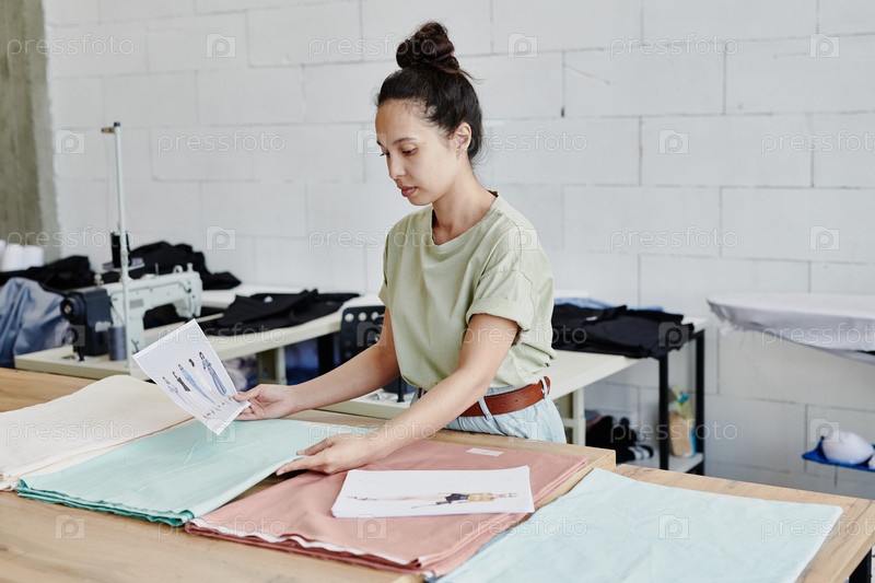 Молодой креативный дизайнер моды ищет подходящий текстиль для новой коллекции