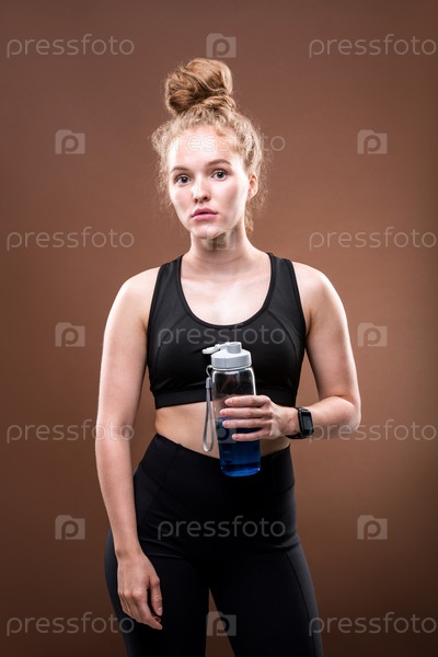 Красивая спортсменка с светлыми кудрявыми волосами, держащая пластиковую бутылку с голубым напитком