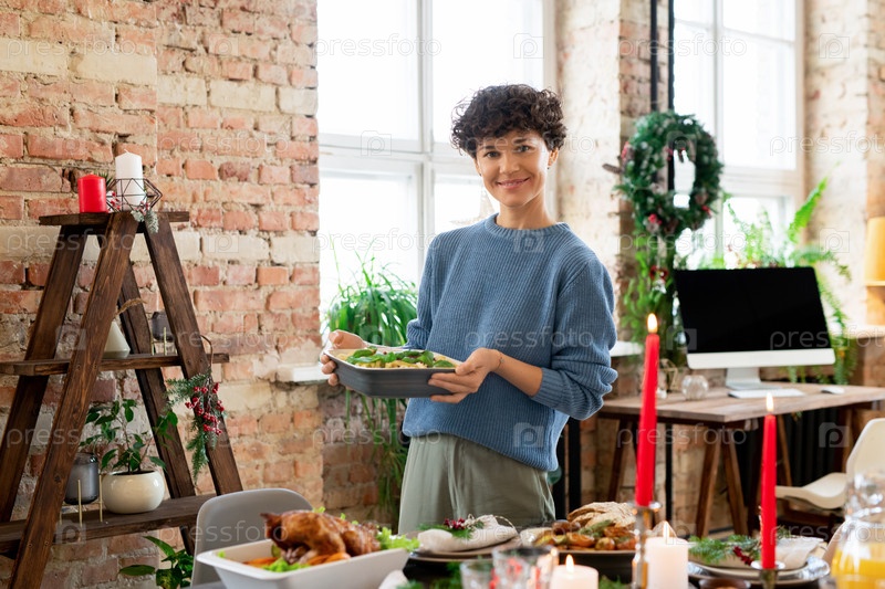 Молодая веселая женщина, несущая миску с домашней макароной с кетчупом и травами