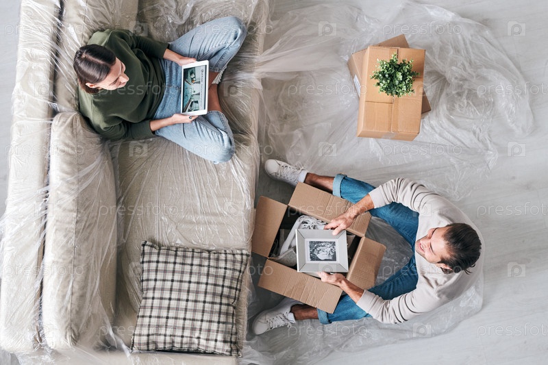 Вид сверху молодой женщины с планшетом, разговаривающей со своим мужем с картинкой в кадре