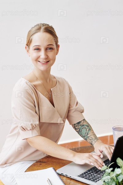 Веселая женщина, работающая в офисе