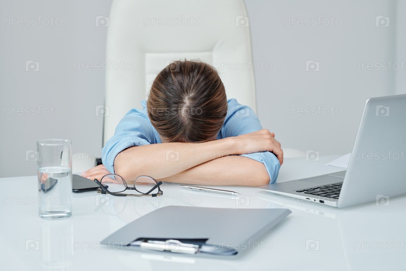 Молодая измученная бизнес-женщина держит голову на крещеных руках на столе