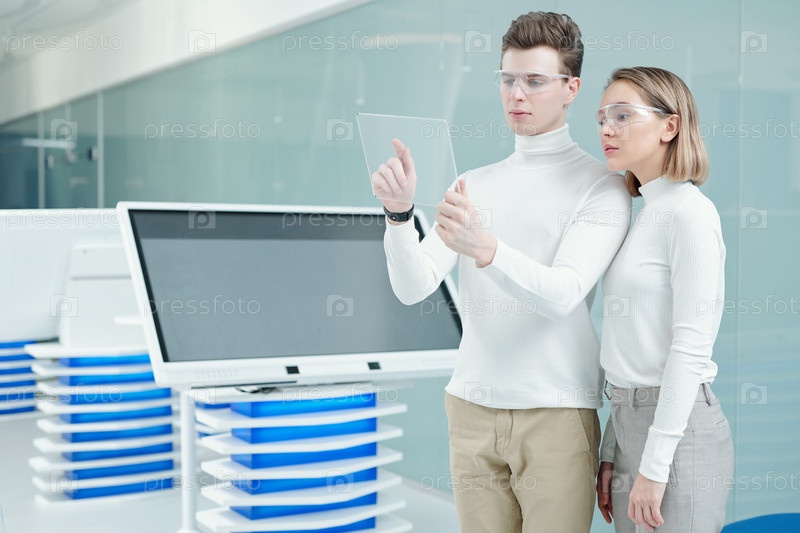 Умный молодой человек и его коллега в умных очках смотрят на дисплей планшета