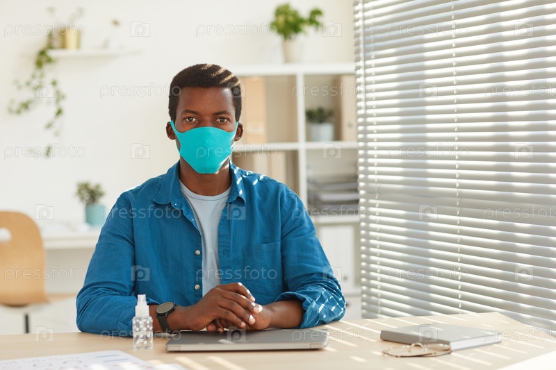 Африканский человек за столом в офисе после пандемии