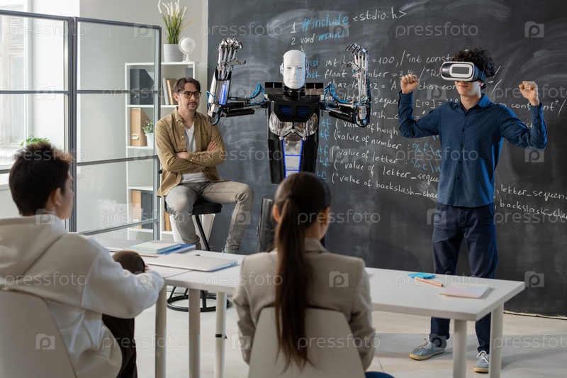 Современный студент с VR гарнитурой демонстрирует способности автоматического робота