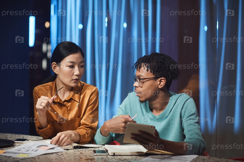 Этнические бизнесмены, работающие в темном офисе