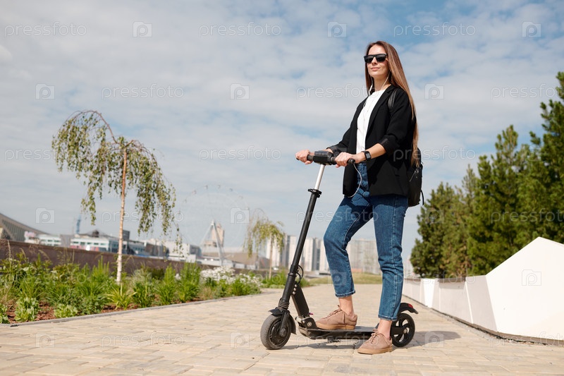 Молодая бизнесвумен в солнцезащитных очках стоит на скутере в городской среде