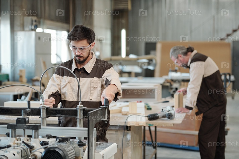 Молодой серьезный работник завода, стоящий у рабочего стола во время обработки