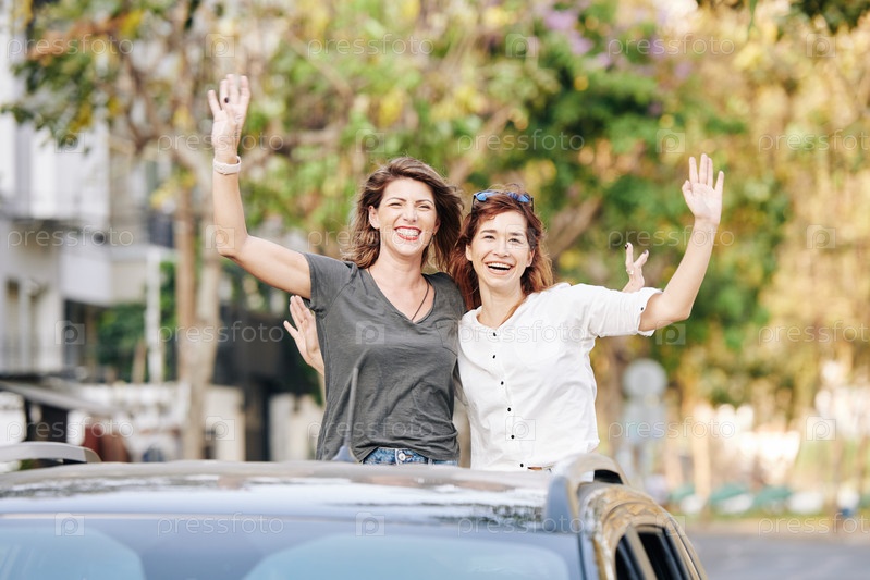 Счастливые путешественники машут руками