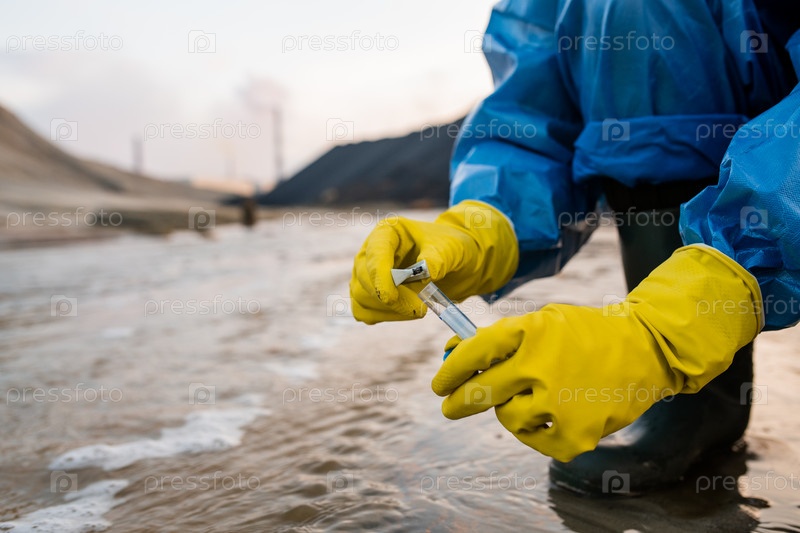 Современный эколог в резиновых перчатках и сапогах и защитных синих комбинезонах