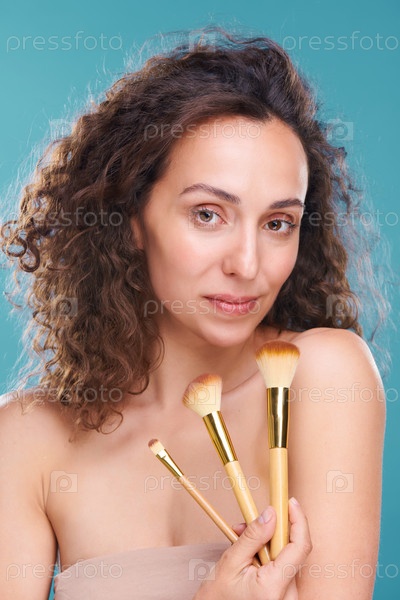 Женщина с тремя профессиональными косметическими щетками для краски, порошка и тени для глаз