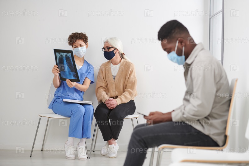 Выборочный фокус снимок мужчины, носящего маску на лице сидит на стуле в коридоре больницы и ждет время консультации с помощью смартфона, современный врач показывает рентгеновский кадр женщине на заднем плане