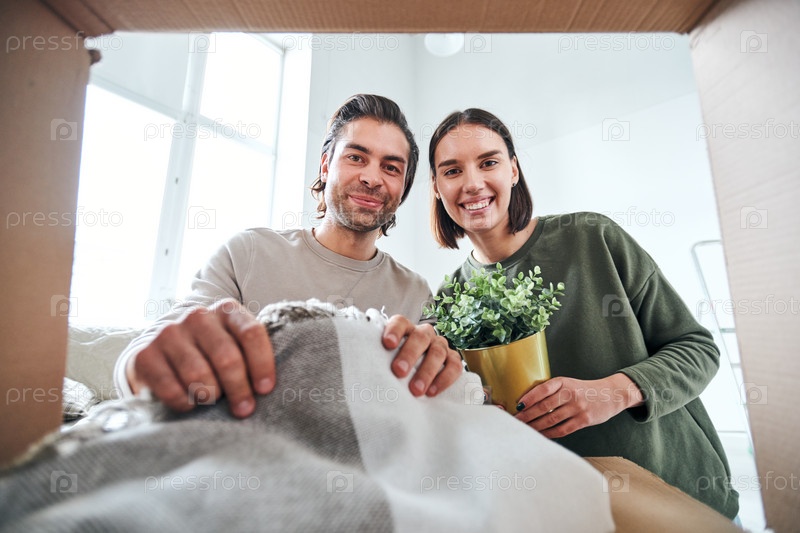 Молодые веселые муж и жена смотрят на вас, разрабатывая коробки