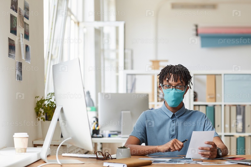 Афроамериканский мужчина, носящий маску во время работы в офисе