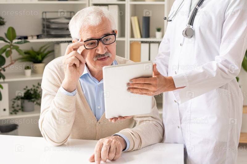 Старший пациент в очках и повседневной одежде смотрит на данные на дисплее планшета