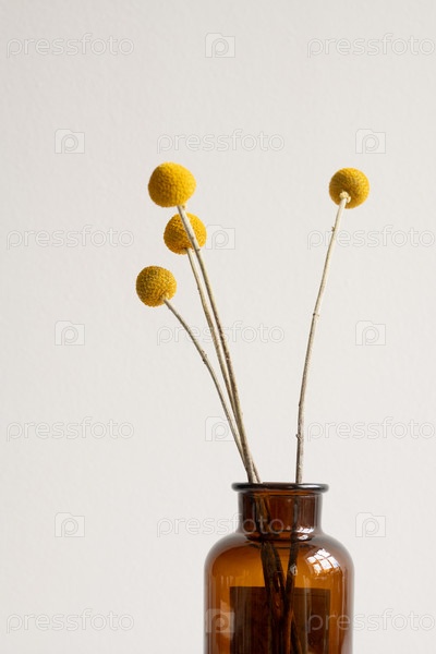 Группа желтых сушеных диких цветов на длинных стеблях, стоящих в темной бутылке или вазе