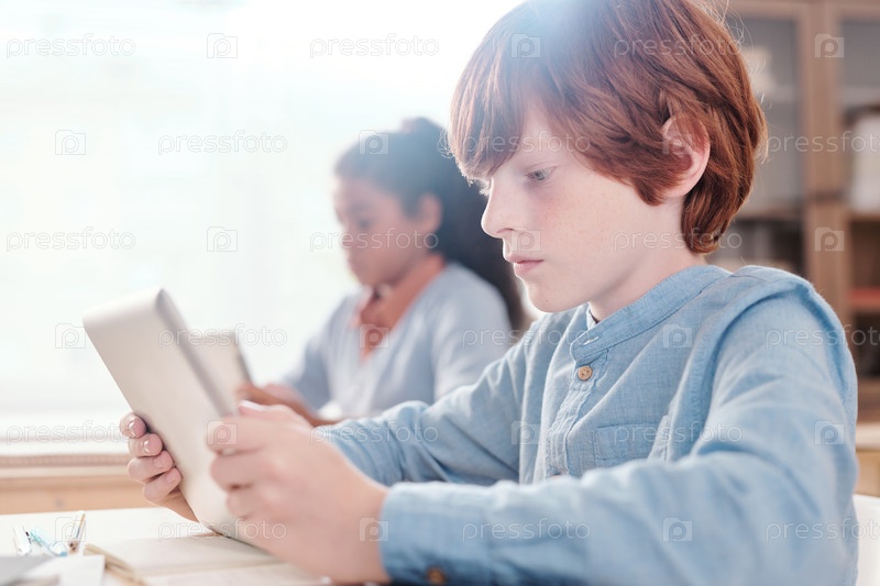 Серьезный умный школьник с сенсорной панелью, просматривающий онлайн-документ