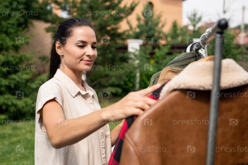 Женщина делает покупки на гаражной распродаже
