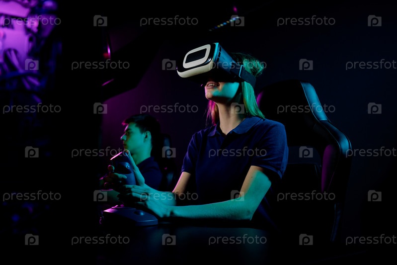 Девушка в очках VR с помощью рукоятки джойстика