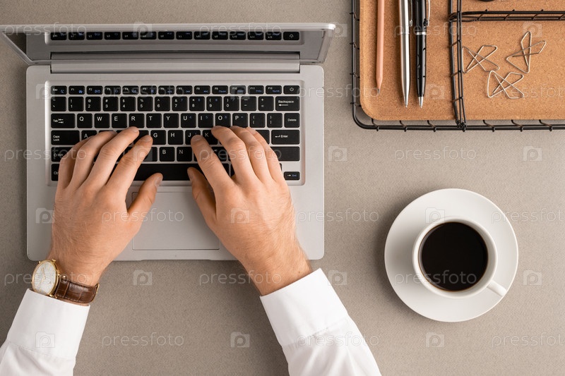 Верхний вид рук современного менеджера, нажимающего кнопки клавиатуры ноутбука