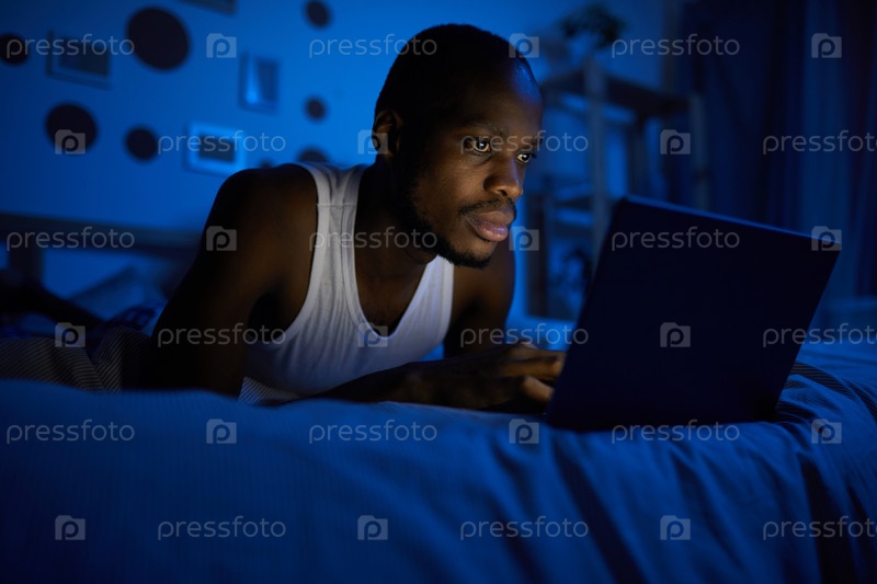 Мужчина, использующий ноутбук в постели африканский
