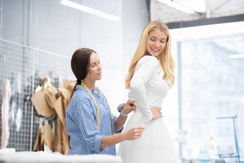 Швея подходит к свадебному платью