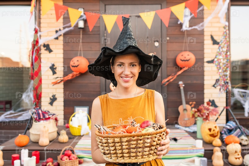 Красивая молодая женщина в черной шляпе, ведьма Хэллоуина держит корзину со сладостями