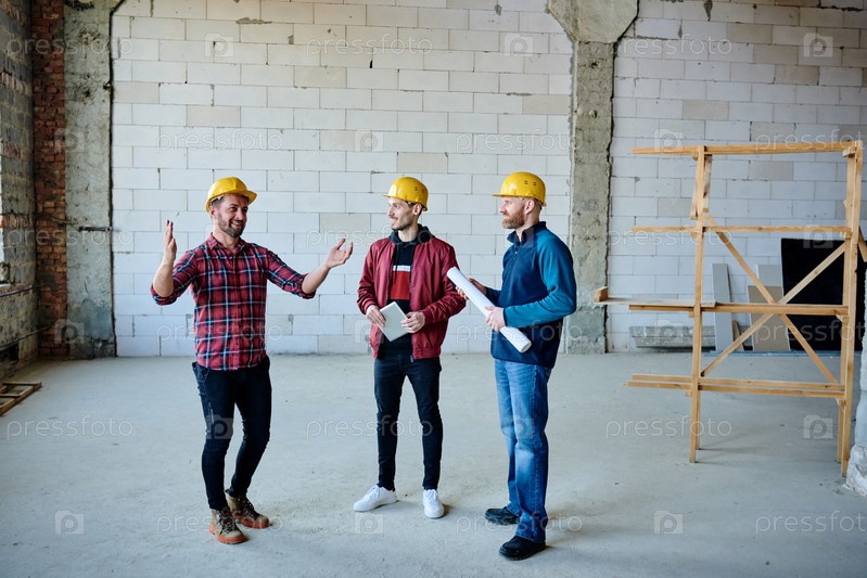 Счастливый молодой инженер или строитель объясняет коллегам, что еще следует сделать