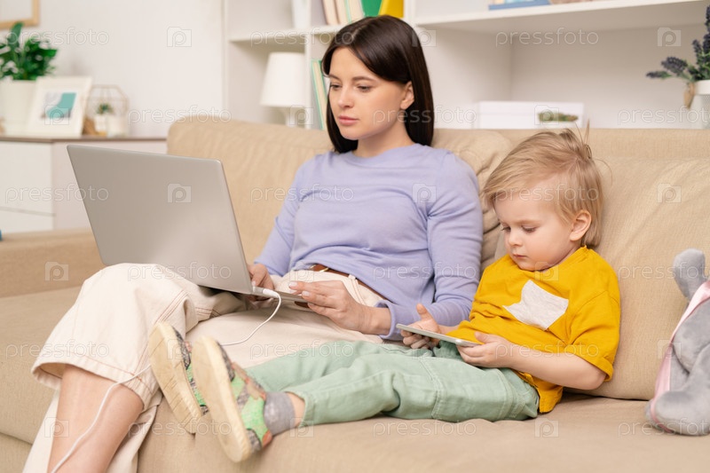 Молодая женщина с ноутбуком работает удаленно, пока ее маленький сын смотрит мультфильм