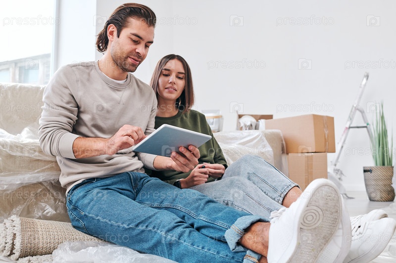 Молодой человек в повседневной одежде серфирует по сети, когда ищет новую мебель