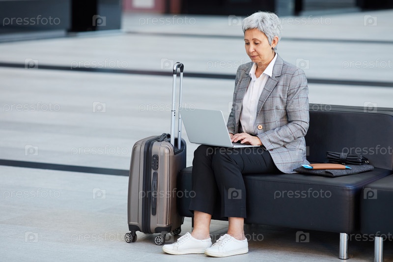 Женщина, использующая ноутбук в аэропорту