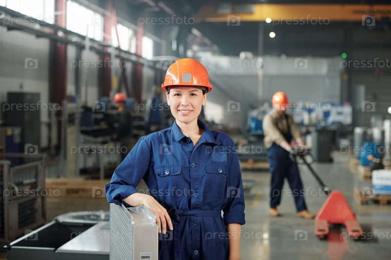Счастливая юная улыбающаяся инженера-женщины в жесткой шляпе и синих комбинезонах