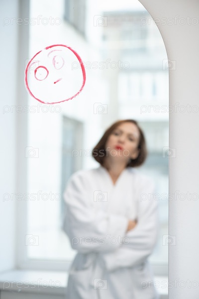 Вдумчивая женщина стоит перед зеркалом с пустым лицом, нарисованным помадой